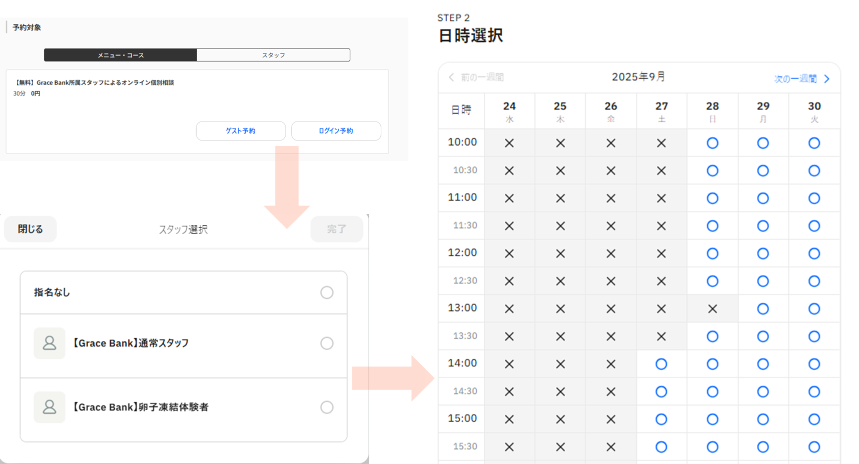 ②個別相談は【通常スタッフ】または【卵子凍結体験者】を選択いただけます。