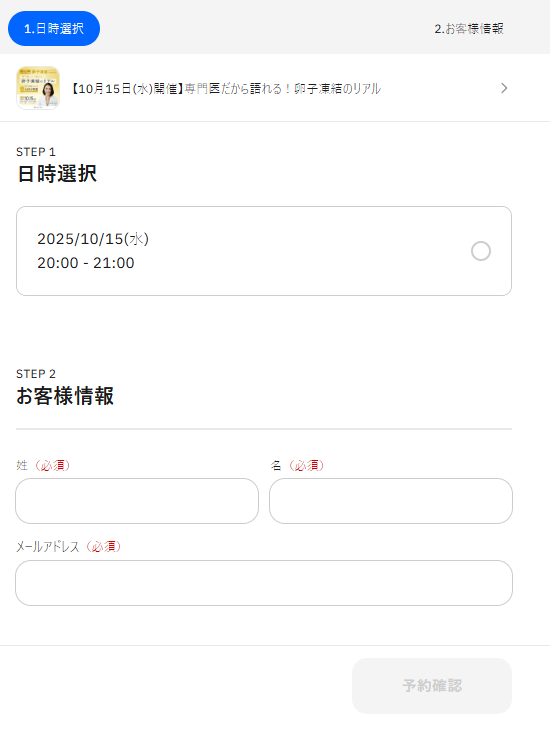 ※予約の申し込みは1日前の23時59分まで、日程変更・キャンセルは予約日時の1時間前まで可能です。