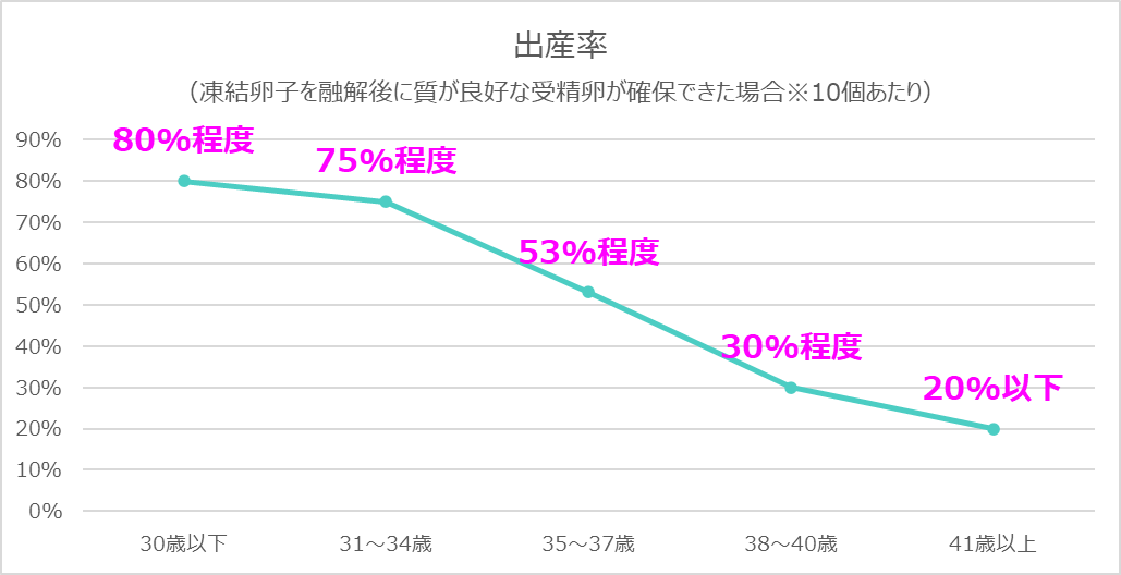 | 年齢 | 出産率(凍結卵子を融解後に質が良好な受精卵が確保できた場合※10個あたり) |