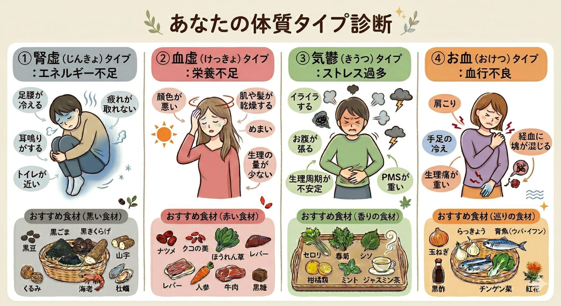 薬膳の基本は「自分の体に足りないものを補う」ことです。以下のチェックリストから、ご自身の体質に近いものを選んでみてください。