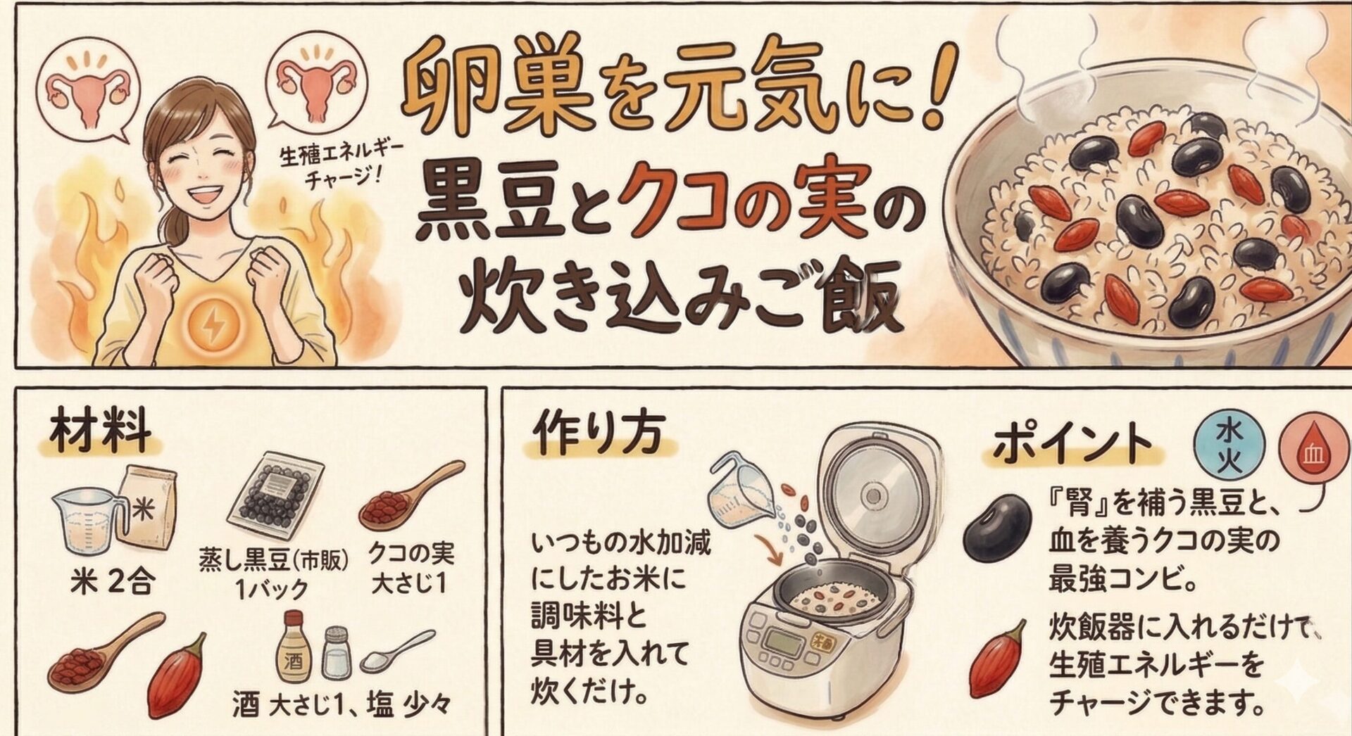 ポイント: 「腎」を補う黒豆と、血を養うクコの実の最強コンビ。炊飯器に入れるだけで、生殖エネルギーをチャージできます。