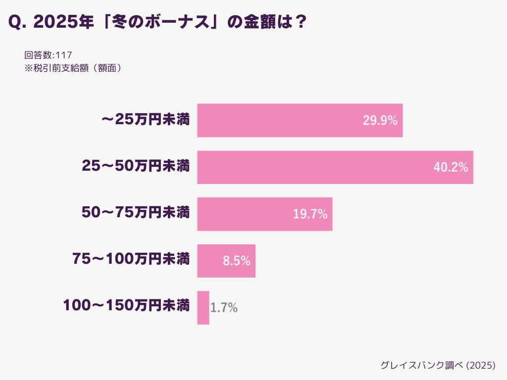 ボーナスが出た人に金額を聞いてみると、「〜50万円未満」と回答した人の合計が66.7%でした。この結果から、ボーナスを受け取った人の約3分の2が、50万円に届かない金額であったことがわかります。