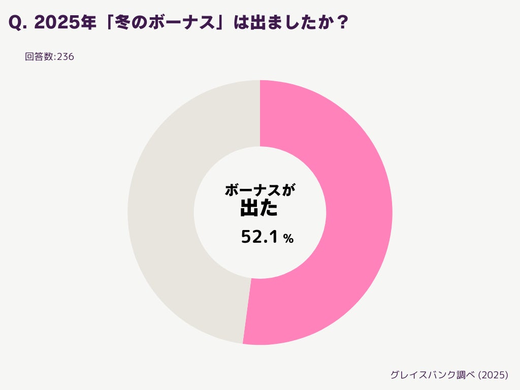 300名の30代未婚女性のうち、現在仕事をしている236名の回答によると、今年の冬のボーナスが「出た」人は52.1%で半数を超えました。